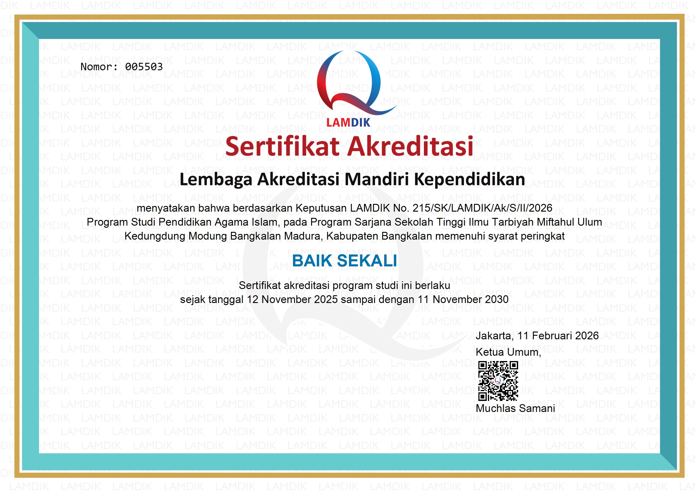 Alhamdulillah, Program Studi Pendidikan Agama Islam (PAI) Program Sarjana STIT Miftahul Ulum Bangkalan resmi meraih peringkat Akreditasi “Baik Sekali” dari Lembaga Akreditasi Mandiri Kependidikan (LAMDIK) berdasarkan Keputusan LAMDIK Nomor 215/SK/LAMDIK/Ak/S/II/2026.